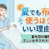 重い布団が落ち着くという人もいれば、軽い方が寝返りしやすいという人もいます。自分の好みに合わせて素材を選んでみてください。