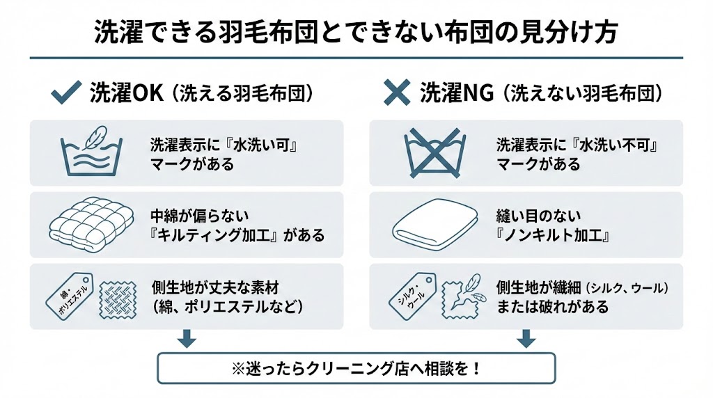 多くの羽毛布団はコインランドリーで洗うことが可能です。ただしすべての製品が対応しているわけではありません。まずは自分の布団が水洗いに耐えられる仕様かどうかを、客観的な基準でチェックしましょう。