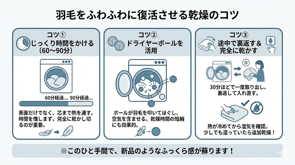 短時間で済ませようとせず、1時間以上の連続乾燥を基本にしてください。しっかり熱をかけることで、羽毛が1本ずつ開き、本来の膨らみが戻ります。