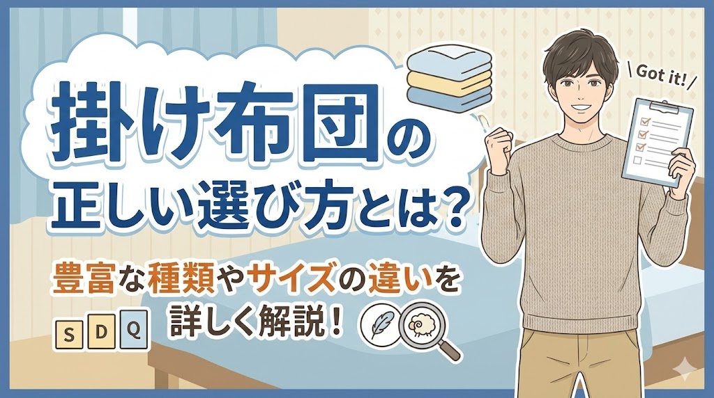 毎日使う掛け布団ですが、種類が多すぎて何を買えばいいか迷いますよね。掛け布団の正しい選び方とは、自分の体質や住んでいる地域の気温に合わせることです。この記事では、素材やサイズの違いを詳しく解説します。