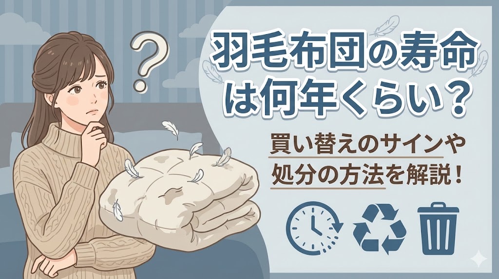 羽毛布団の寿命は約10年から15年ですが、使い方やお手入れで大きく前後します。ボリュームの低下や羽毛の吹き出しといったサインを見逃さず、適切なタイミングで買い替えや打ち直しを検討しましょう。