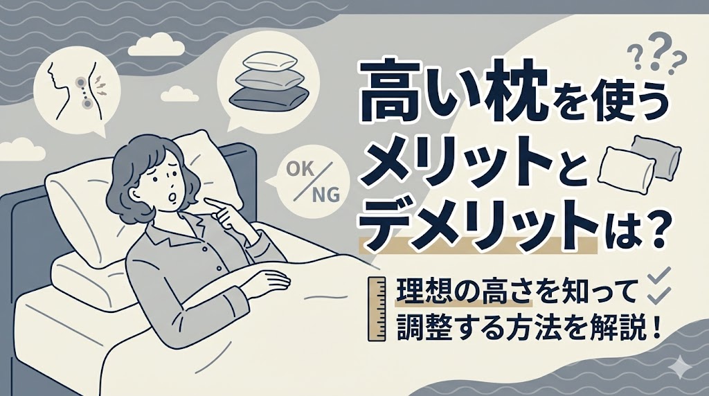 高い枕には横向き寝の負担を減らすなどの良さがありますが、高すぎると首の痛みやいびきの原因になります。理想の高さは、壁を使った計測や寝たときの顔の角度から簡単に見つけることが可能です。もし今の枕が高いと感じたら、中材を抜いたり背中にタオルを敷いたりして、まずは首の角度を緩めてみてください。